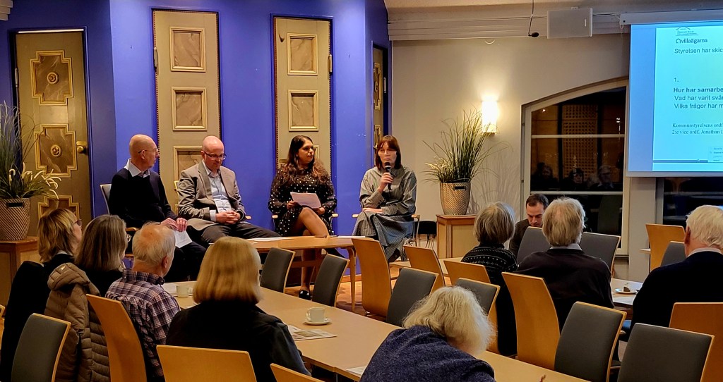 Den 13 november samlades 17 personer, varav sju styrelsemedlemmar, i Barkarby församlingshem för att delta i kvällens aktiviteter. Även om deltagarantalet var mindre än önskat, gavs möjligheten att fika och lyssna till fyra representanter från Järfälla kommunstyrelse som var inbjudna för att informera och diskutera kommunens framtida utveckling. De närvarande politikerna – kommunstyrelsens ordförande Eva Ullberg (S), förste vice ordförande Emma Feldman (M), andre ordförande Jonathan Björniden (L) samt ledamoten Patric Andersson (MP) – hade inför mötet fått ta del av sex frågor från styrelsen för att kunna förbereda sig ordentligt.