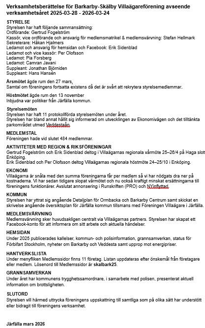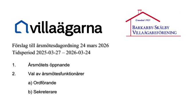 Barkarby-Skälby Villaägareförening inbjuder härmed sina medlemmar till årsmöte, som hålls tisdagen den 24 mars kl. 19.00 i Barkarby församlingshem på Kyrkvägen 8.