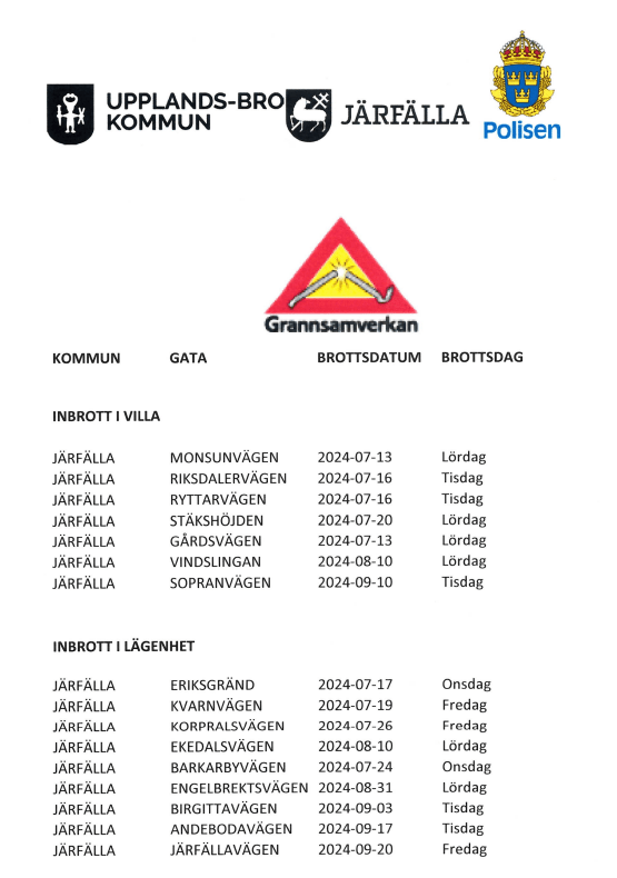 Statistik över inbrott och försök till inbrott i Järfälla och Upplands-Bro från tredje kvartalet 2024. Fortsatt mycket lugnt i våra kvarter, endast en fastighet i Skälby har drabbats under kvartalet dvs. juli, augusti, september och som tidigare så är det fler lägenheter än villor som utsatts för inbrott.