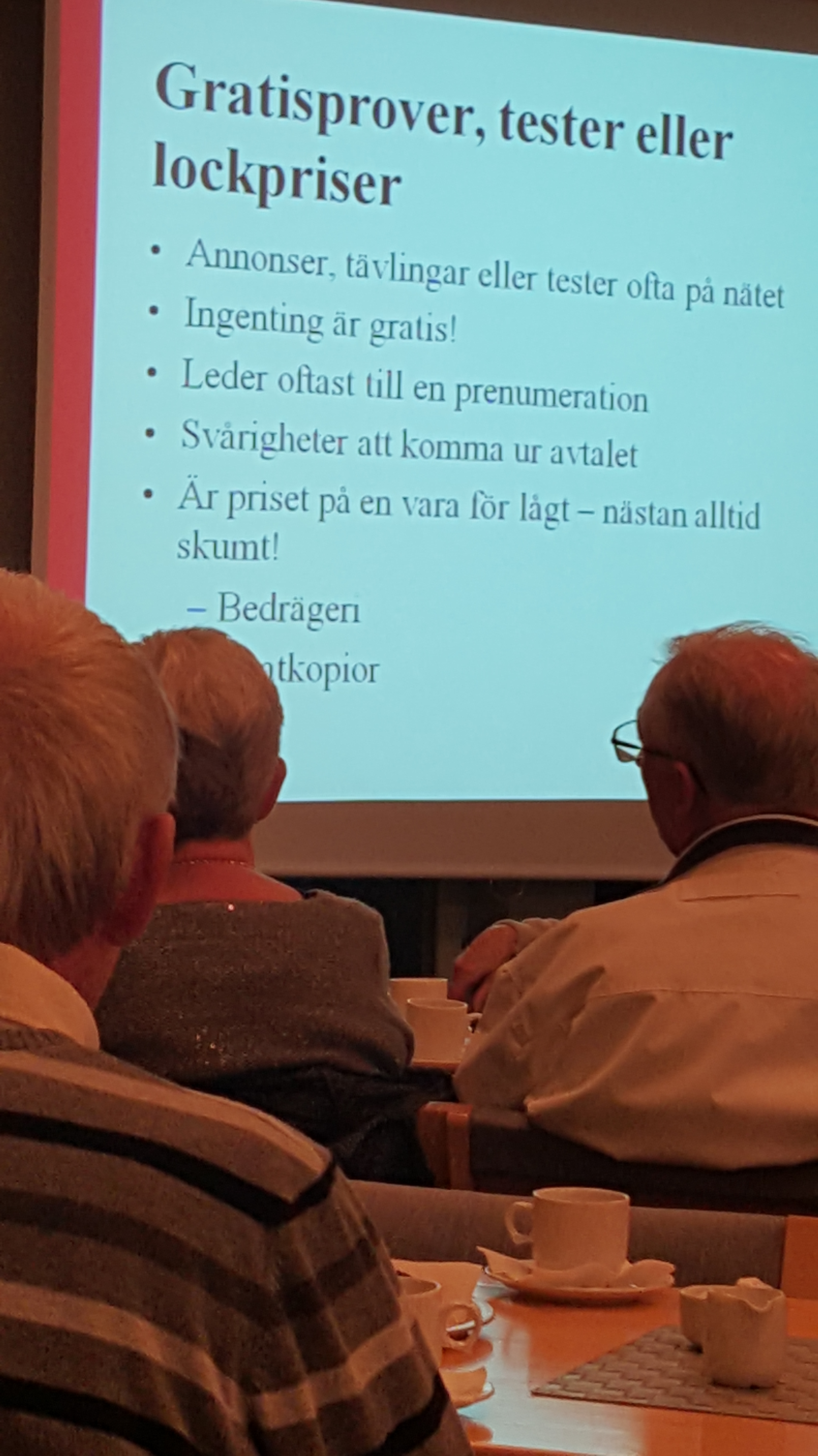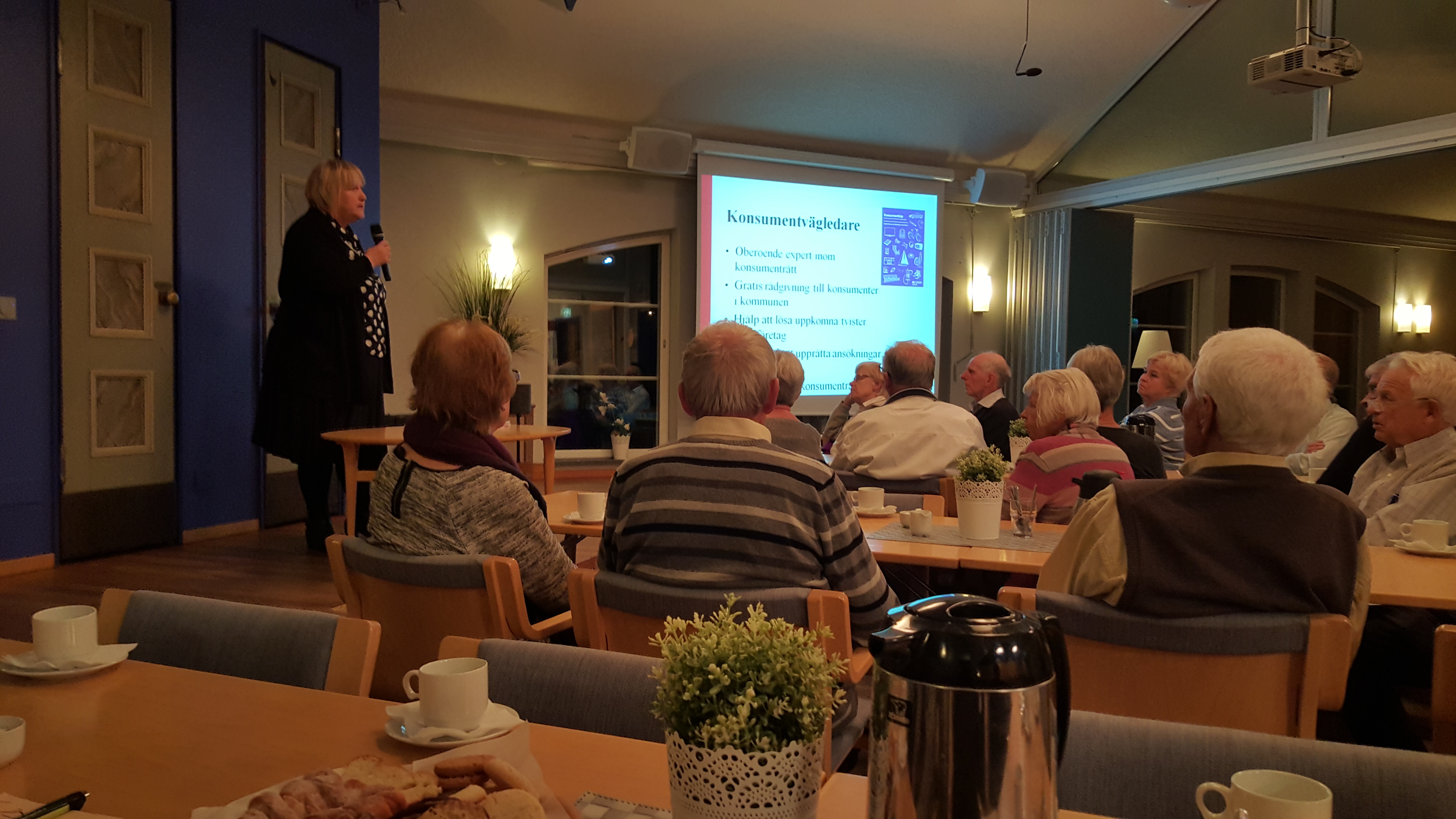 Tisdagen den 20 oktober var kommunens konsumentvägledare Anne Rosenberg inbjuden till föreningens höstmöte för att berätta om våra rättigheter och skyldigheter som konsumenter. Närmare 40 personer hade vigt denna afton för att förbättra sina kunskaper om till exempel: ogiltiga, oskäliga, undantag från (bindande) bundenhet, avbeställningsrätt, öppet köp, bytesrätt, ångerrätt och mycket mera som Anne beskrev med tydliga exempel på hur man bör och kan agera som konsument. Anne fick svara på många frågor och hon gav flera goda råd bland annat om att anmäla sin telefon till NIX för att slippa störande försäljare samt att man måste anmäla samtliga telefonnummer, både fast och mobil telefon. Nummer till NIX: 077-228 00 00. Ytterligare tips: skaffa en digital brevlåda för kommunikation med myndigheter och på så sätt undvika att värdefull post försvinner från brevlådan vid gatan. Här en länk till information om digital brevlåda. Behöver man konsumentrådgivning så har Järfälla kommun den servicen för sina invånare: Ring kommunens Servicecenter tfn 08-580 285 00