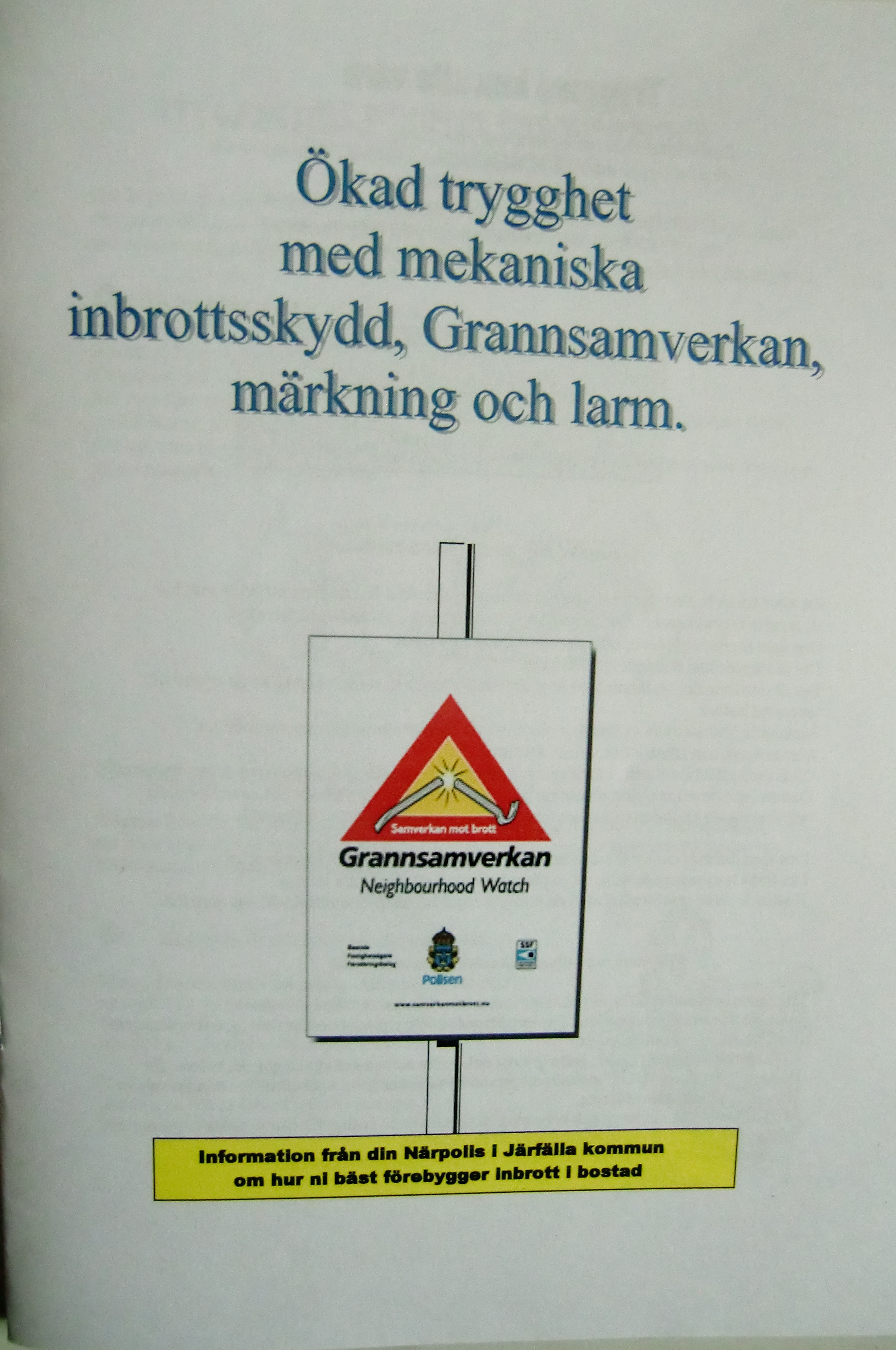 I broshyren Ökad trygghet med mekaniska inbrottsskydd, Grannsamverkan, märkning och larm har Närpolisen i Järfälla kommun tillsammans med Grannsamverkan försökt samla alla goda råd och tips på hur man bäst förebygger inbrott i bostaden.